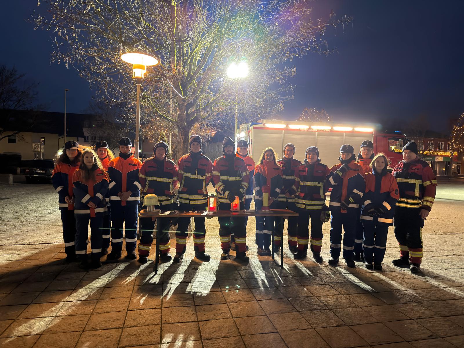 Sicherheitswache auf dem Kirchplatz, Ausleuchten bei der Übergabe vom Friedenslicht vor der Stadtpfarrkirche St. Ulrich.